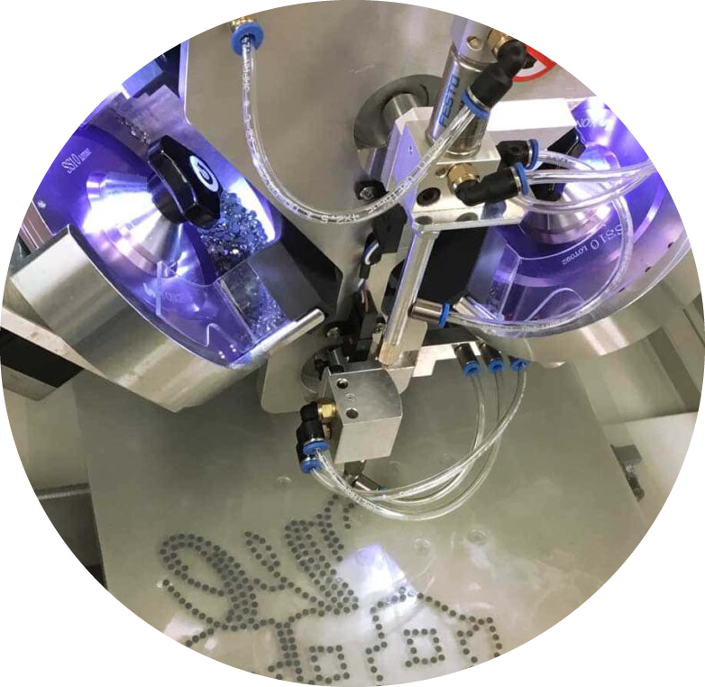Our 6 color automatic rhinestone setting machines make fast work of your design needs. Offering transfer and finished garments