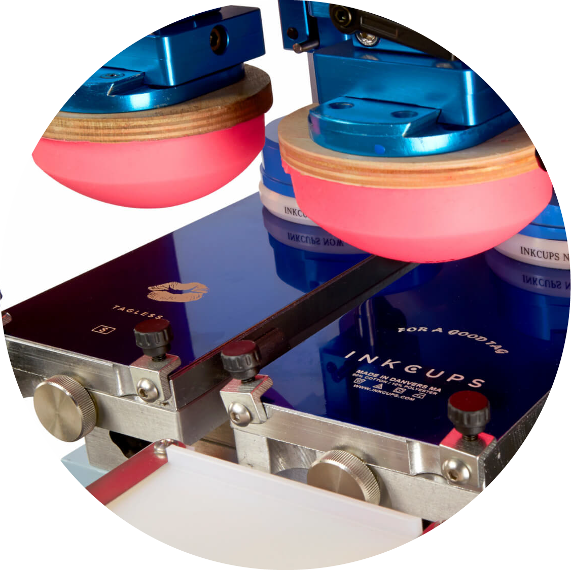 Our operation uses Inkcups 2 color pad printing technology to produce high quality finished products from pens & golf balls to shirt tags.